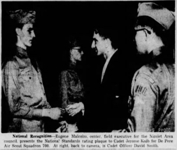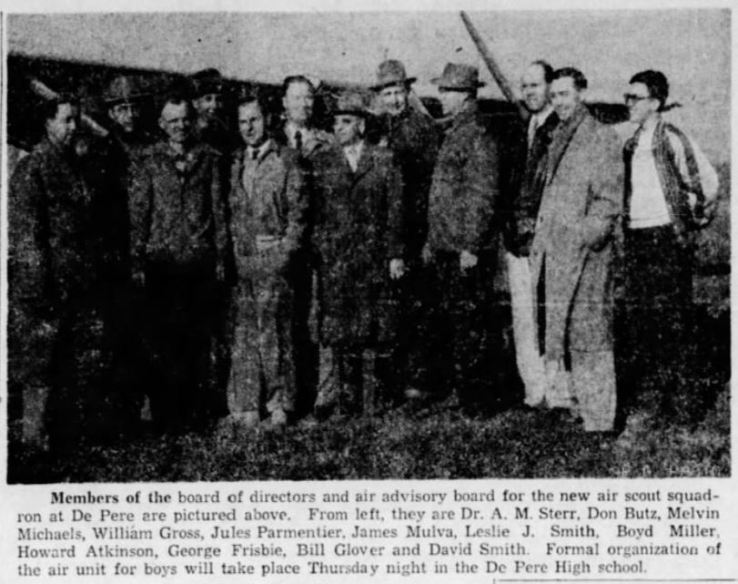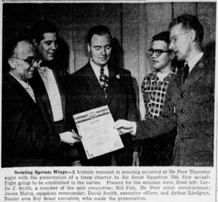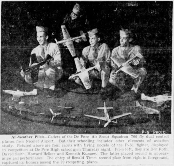 That all brings us to De Pere, in August 1951. Local 15 year-old David Smith (432 S. Erie St.), was taking flying lessons from flight instructor James Mulva, Sr. David loved learning to fly and often wished other boys his age could take part in the same flight training. David, whom had already been a member of Boy Scouts for the past 6 years, began to dream of a Boy Scout troop that actually took to the skies.² At the time, it was a federal law that you had to be 16 years of age to obtain a pilot’s license, (now it is 17) but you could start flying lessons prior to your birthday.