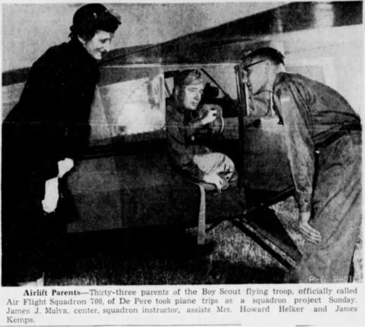 At this point, the Air scouts’ activities began to intrigue their biggest and most supportive fans; Mom and Dad. Squadron Commander James Mulva decided to invite them for a birds-eye-view of the proceedings so they could see what their hardworking boys had accomplished. Thirty-three out of the 36 parents agreed to take a gander at the beautiful surroundings from the blue skies. At least one parent from each of the 21 scouts attended. It is possible, due to the ongoing Korean war conflict taking place at the time, that not all the parents were present stateside. While the parents enjoyed their delightful experiences above in the azure skies, The Air Scouts remained on the ground where they served as a reception committee. The parents took flight from Nicolet Airport, each of them logging about 15 minutes in the air. After the flights, a party was held in the Director’s room at the State Bank of De Pere.⁸