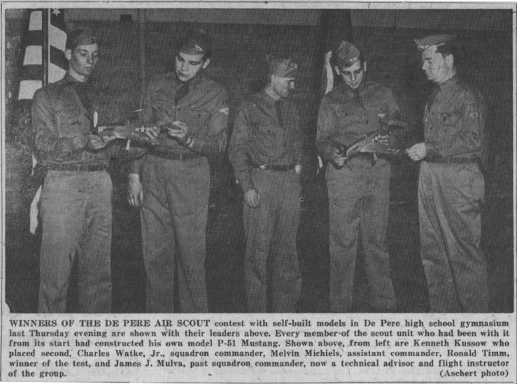 The following is a list of every air scout I found listed in the newspaper (alphabetical order) : Frank Buethe, James Clumpner, Lauy Christensen, Grant Dieck, Robert Durbrow, Larry Francken, Fred Freiburg, Bernie Fritsch, Donald Gibbons, James Guerts, Howard Helker, Eugene Hendricks, William Hendricks, Bernard Janssen, Norman Jansen, Ronald Kane, Kenneth Kannan, James Kemps, Kenneth Kleuskens, Jerome Kolb, Kenneth Kussow, Joe Laes, Bill Leithold, Louis McAbee Jr., Roger McAbee, Ronald McAbee, Ted Newell, Tim Nuthals, Ronald Paque, Jerome Rickaby, Donald Roth, Ellsworth Schinke, Ed Senecal, David Smith, Clayton Smits, Neil Smits, Richard Staeven, James Stoddard, John Sundstrom, Leonard Thompson, Ronald Timm, Lowell Turriff, and Ted Wiechers.