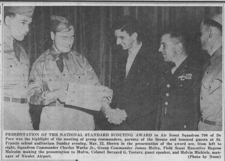 Young David presented his thoughts to Art Lindgren, scout executive of the Nicolet Area Council. This historical meeting turned out to be the birth of Air Scout Squadron 700, otherwise known as the Air Scouts of De Pere. David’s flight instructor, James Mulva Sr., volunteered to command the squadron, and shortly after the establishment of this momentous group, they secured the De Pere Rotarians as a sponsor. From this point forward, their home base for instruction and most activities was at the St. Francis School Hall.