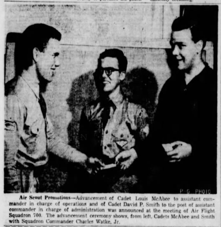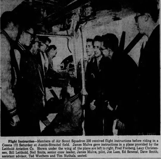 From 1951 to 1953 the newspapers covered the local Air Scouts incessantly. However, after August of 1953 (above) there was only one more article, four years later in 1957. In the picture below James Mulva was still conducting flight training and David Smith was still involved as an assistant. What used to be called Air Squadron 700 was now listed as 200. Perhaps, soon after the program was ended or reduced in scope.