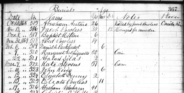 His hands and feet were then tied and he was told that he had but four minutes of time left. He then, in a low gutteral voice repeated the Lord’s prayer in the musical language of the Oneida. Mr Goodenough commenced reading the service during which the prop was knocked out and Jacob Powless was on the confines of eternity. He struggled but little, although it is probable his neck was not broken. After hanging fifteen minutes his body was cut down and buried immediately in a corner of the cemetery.”